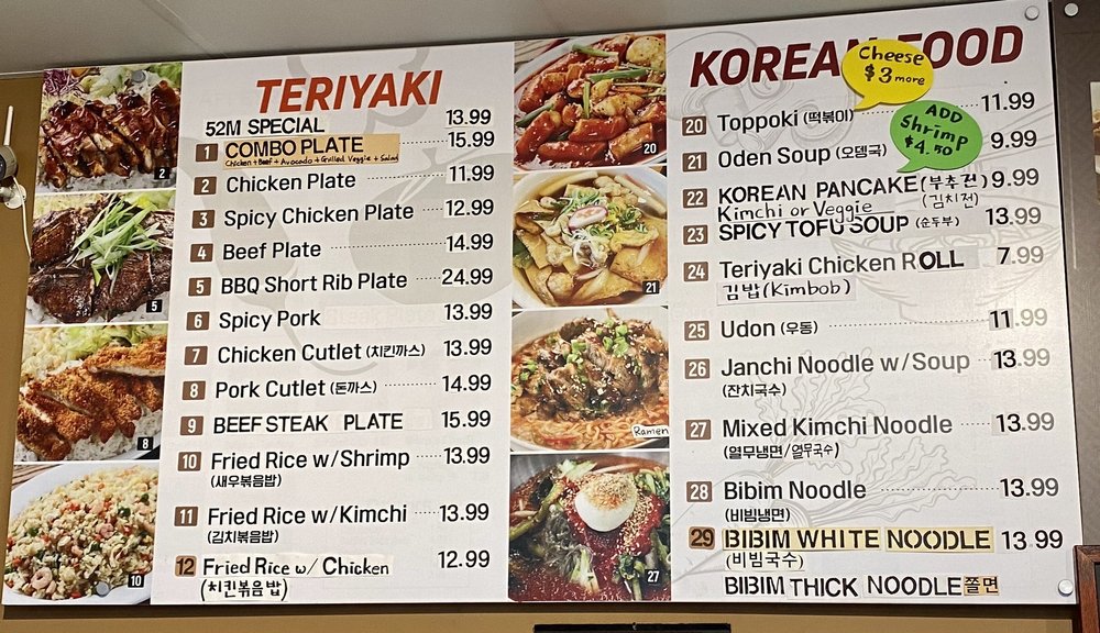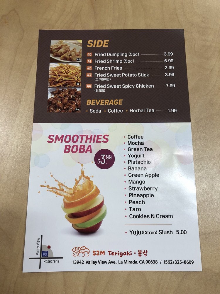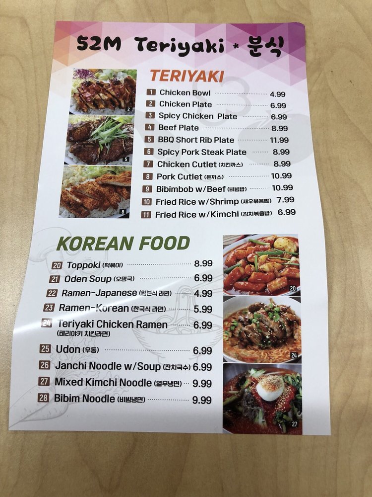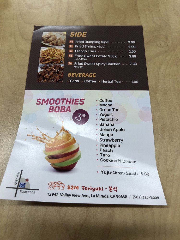 At 52M Teriyaki, located in La Mirada, CA, you can indulge in a delicious combination of Korean, Bubble Tea, and Japanese cuisine. From flavorful Teriyaki Combo Plates to authentic Korean dishes like Toppoki and Spicy Squid Stir Fry, there is something to satisfy every craving. The Fried Shrimp and Teriyaki Chicken Skewers are perfect for sharing or enjoying as a side. Customer reviews rave about the tasty and tender Teriyaki Chicken Bowl and Beef Steak Bowl, highlighting the friendly service and welcoming atmosphere. Whether you're a fan of traditional teriyaki or looking to try something new, 52M Teriyaki offers a diverse menu with options to please every palate. Stop by and experience the unique flavors for yourself.